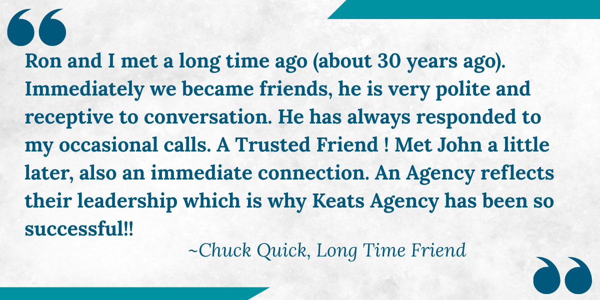 Known affectionately as “Encyclopedia Keats,” Ron brings decades of experience to client conversations, painting a complete picture of coverage and guiding future protection. But it’s not just about his vast knowledge; Matt Lavelle highlights how support is always nearby, “Whether it’s Eric, Cassandra, Ingrid, Chris, or John…someone is always there to pick up the phone and help without hesitation.”