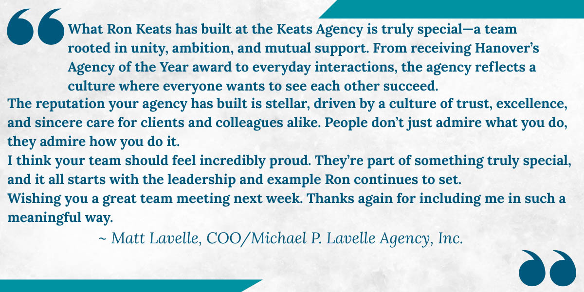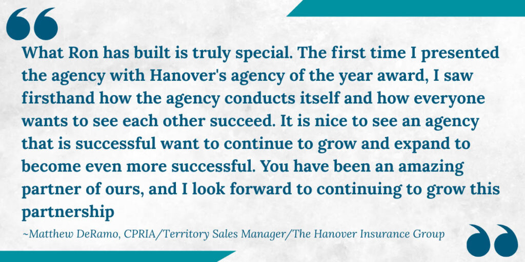His approach isn’t just about success—it’s how that success is earned: with collaboration, respect, and a commitment to each person’s growth. As Matthew DeRamo from Hanover Insurance Group said, Ron has created something “truly special”—a team unified in ambition and support.