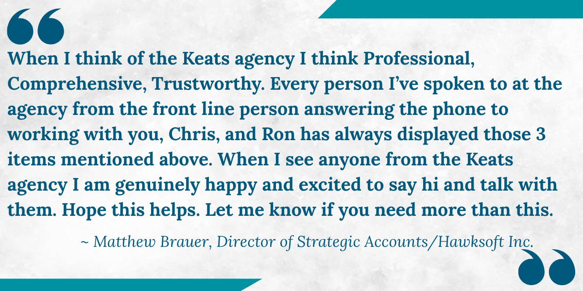 Mathew Brauer from HawkSoft echoes this sentiment, describing every interaction with Keats Agency as professional, thorough, and undeniably warm. That culture doesn’t come by chance – it’s crafted.