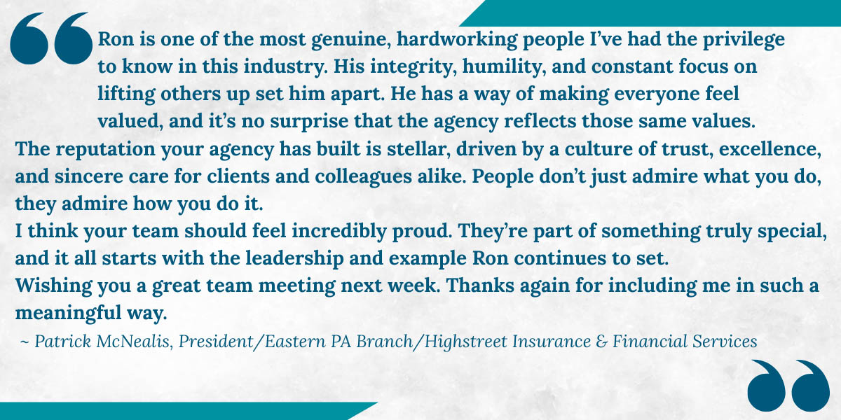 Patrick McNealis, President of Highstreet Insurance & Financial Services (Eastern PA), calls Ron “one of the most genuine, hardworking people” in the industry.